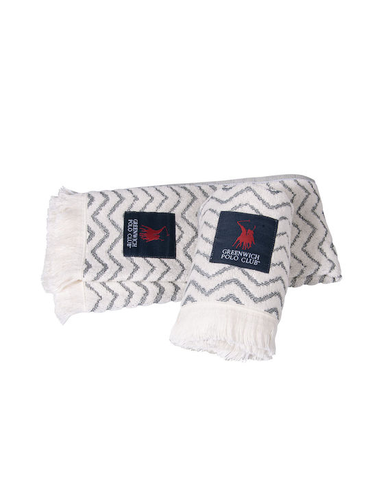 Πετσέτες κουζίνας από τον οίκο Greenwich Polo Club σε γαλάζιο-εκρού χρώμα με γεωμετρικό σχέδιο και διακοσμητικά κρόσια στο τελείωμα.