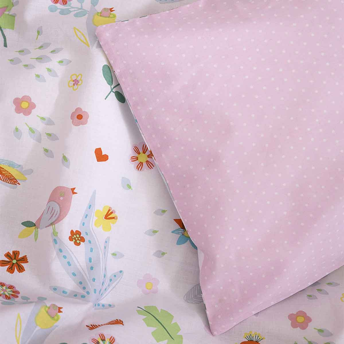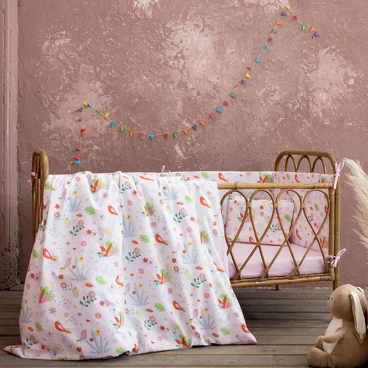 Βρεφικό κουβερλί για την κούνια από την εταιρεία Nima. Το εξωτερικό ύφασμα είναι 100% βαμβάκι 144 κλωστών, απαλό και ανθεκτικό ενώ εσωτερικά έχει λεπτή πολυεστερική βάτα. Έχει λευκό φόντο με σχέδιο ζωάκια και ροζ-πολύχρωμες λεπτομέρειες. Η μία μεριά του έχει το σχέδιο του πανωσέντονου και η άλλη το σχέδιο του κατωσέντονου. Ιδανικό για τους ανοιξιάτικους και καλοκαιρινούς μήνες. Διατίθεται σε υφασμάτινη συσκευασία.