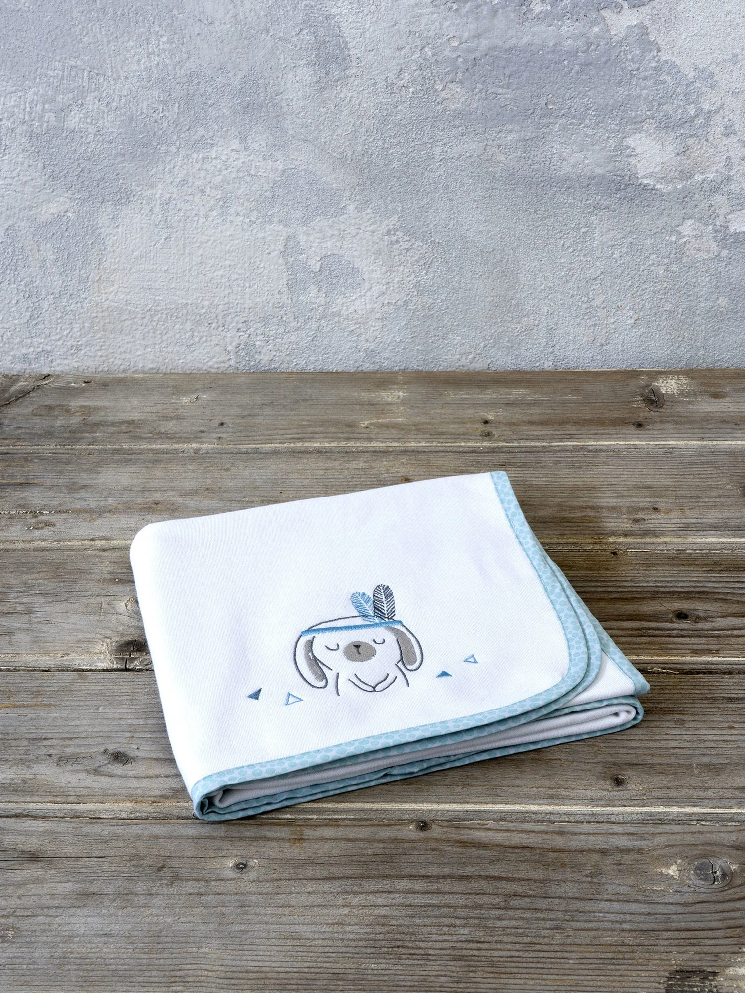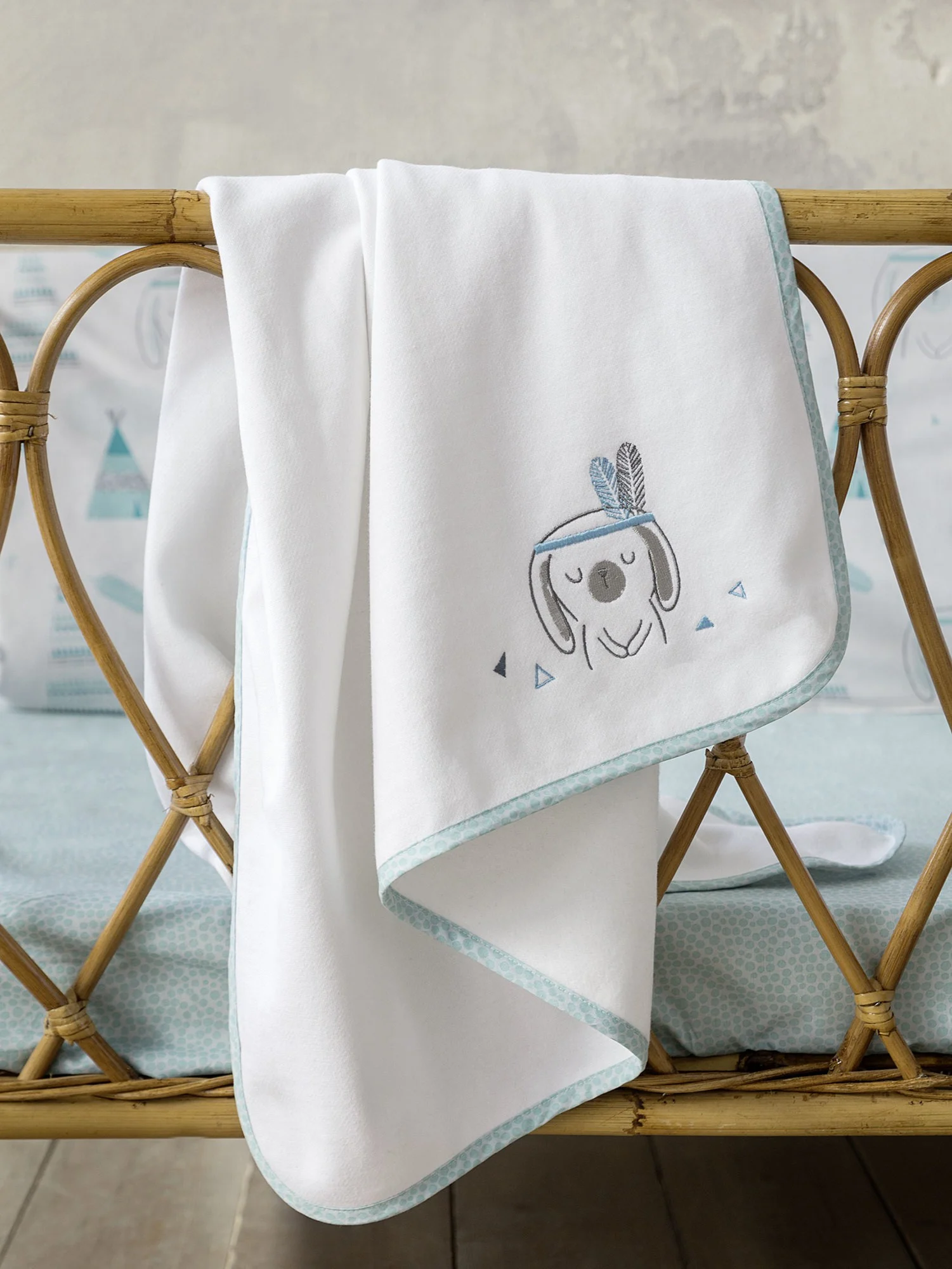 Η βρεφική κουβέρτα Little Indian έχει πανέμορφο κεντητό σχέδιο με κουνελάκι-ινδιανάκι, σε γλυκιές αποχρώσεις του πράσινου – βεραμάν επάνω σε λευκή βάση. Το χρώμα της γαλήνης και της ηρεμίας σε συνδυασμό με ένα σχέδιο που μοιάζει με μοντέρνα εικονογράφηση παραμυθιού, θα μεταμορφώσει το βρεφικό δωμάτιο σε έναν χώρο ιδανικό για τον ύπνο και τη χαλάρωση του μωρού σας. Το μωράκι σας μπορεί να κοιμάται ήσυχο παρέα με το κουνελάκι-ινδιανάκι που θα συντροφεύει τα όνειρά του και τις ώρες παιχνιδιού. Συνδυάστε τη με το αντίστοιχο σετ κούνιας για ένα όμορφο αισθητικό αποτέλεσμα.
