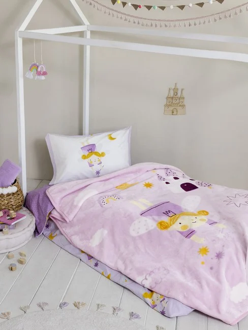 Η παιδική κουβέρτα Odette έχει μαγευτικό σχέδιο, με ένα παραμυθένιο κάστρο και μία γλυκιά νεράιδα που κρατά μαγικό ραβδάκι, όλα σε απαλές αποχρώσεις του λιλά και του κίτρινου, ενώ τα σύννεφα και τα αστέρια ολοκληρώνουν την εικόνα του ονειρικού κόσμου. Η κουβέρτα αυτή δεν είναι μόνο πρακτική αλλά και διακοσμητική, καθώς προσθέτει μία παιχνιδιάρικη και παραμυθένια αίσθηση στο δωμάτιο του παιδιού σας. Ιδανική για αγκαλιές, ύπνο ή χαλαρές στιγμές, αυτή η κουβέρτα είναι η τέλεια συντροφιά για το παιδί σας που λατρεύει τα παραμύθια και την μαγεία. Συνδυάζεται τέλεια με τα ασορτί σεντονάκια ή σετ μαξιλαροθήκες.