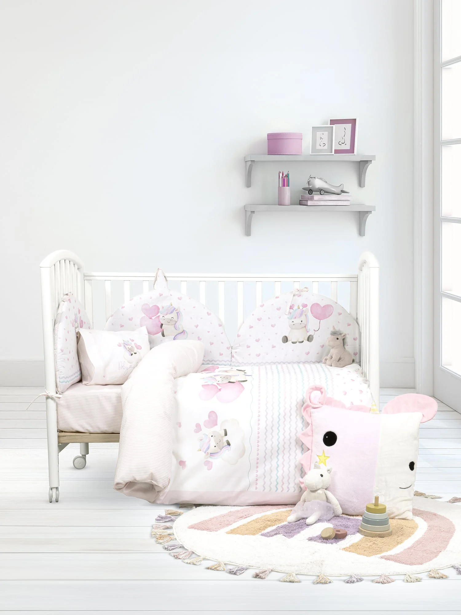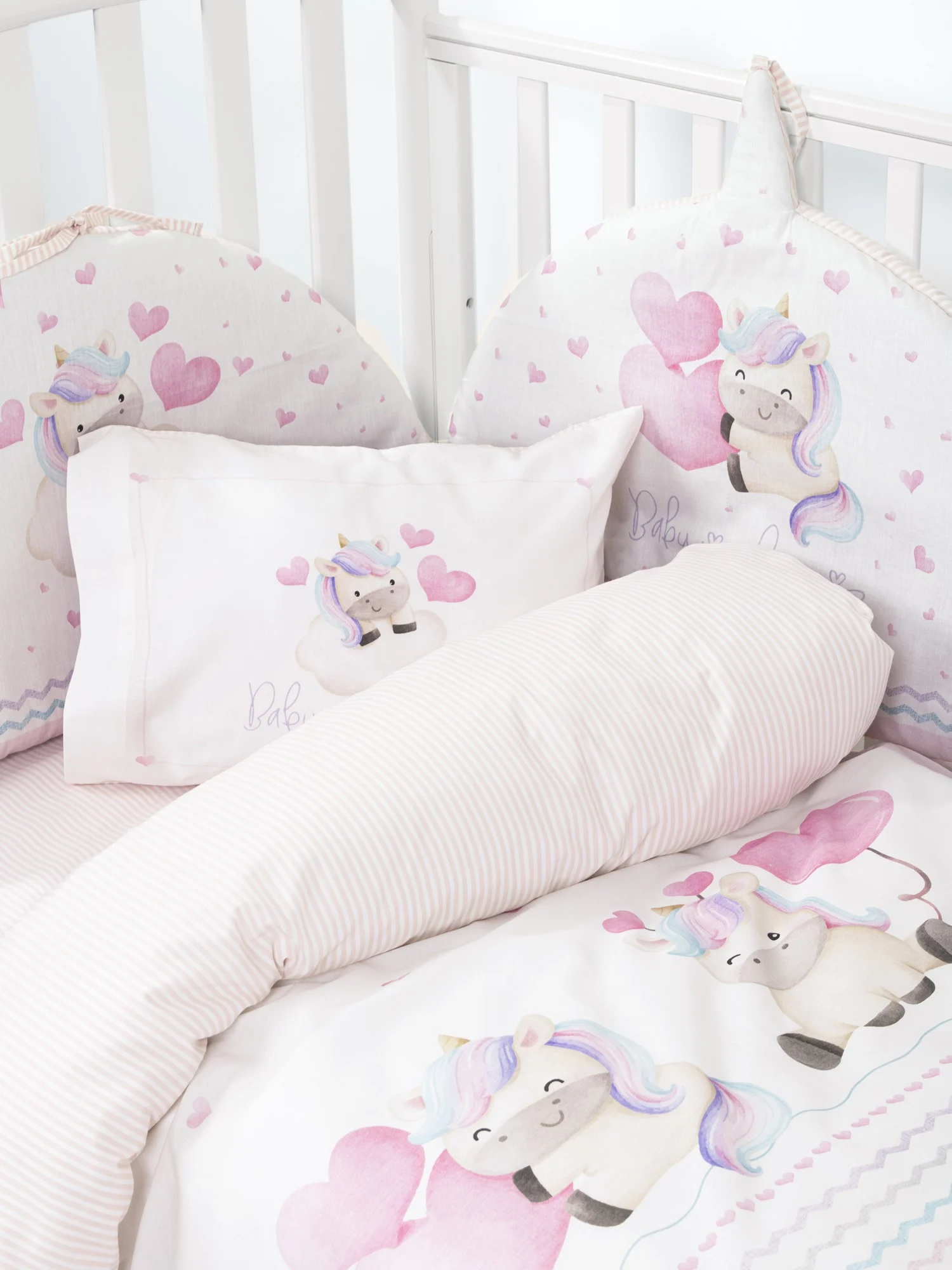To βαμβακερό σετ παπλωματοθήκης κούνιας Luni Uni είναι σχεδιασμένο με ένα παραμυθένιο σχέδιο που θα λατρέψουν τα μωράκια σας. Πανέμορφοι μονόκεροι, μικρά αστεράκια και καρδιές, σε παστέλ αποχρώσεις του ροζ, του λευκού και του γαλάζιου δήμιουργούν ένα ονειρεμένο σκηνικό. Ο συνδυασμός του κεντρικού μοτίβου με τους μονόκερους και τις διακριτικές ρίγες και τα πουά μοτίβα δημιουργεί ένα παιχνιδιάρικο και χαρούμενο αποτέλεσμα. Μια υπέροχη πάνελ μαξιλαροθήκη απογειώνει την εικόνα του στρωμένου κρεβατιού. Μετατρέψτε το δωμάτιο του παιδιού σας σε έναν μαγικό, ονειρεμένο κόσμο συνδυάζοντας το σετ παπλωματοθήκης Luni Uni με την ασορτί πάντα, ή και την βελουτέ κουβερτούλα Luni Uni.