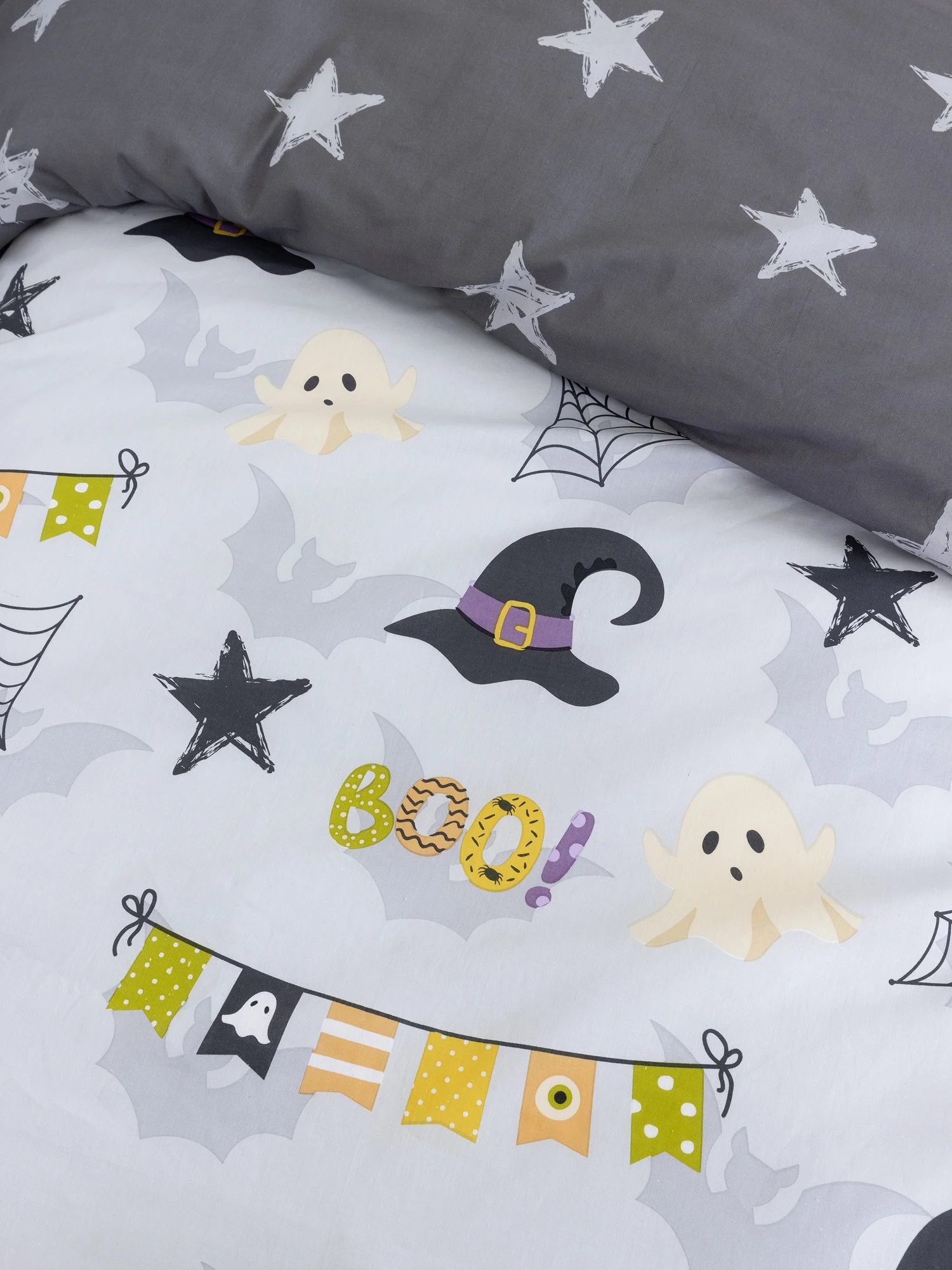 Το βαμβακερό σετ σεντονιών “Boo!” θα μετατρέψει το κρεβάτι του παιδιού σας σε ένα μαγικό και διασκεδαστικό σκηνικό για τις πιο παιχνιδιάρικες βραδιές. Με ένα χαρούμενο και φαντασμαγορικό μοτίβο, διακοσμημένο με φιλικά φαντασματάκια, καπέλα μάγων, ιστούς αράχνης και πολύχρωμες σημαιούλες, αυτό το σετ συνδυάζει το μυστήριο με μια παιχνιδιάρικη αίσθηση. Οι γκρι και μαύρες αποχρώσεις του φόντου δημιουργούν την τέλεια αντίθεση με τα ζωηρά χρώματα των λεπτομερειών και δίνουν μια αίσθηση εορταστικής διασκέδασης. Ιδανικό για να εμπνεύσει τη φαντασία των μικρών παιδιών και να κάνει τον ύπνο μια διασκεδαστική εμπειρία.