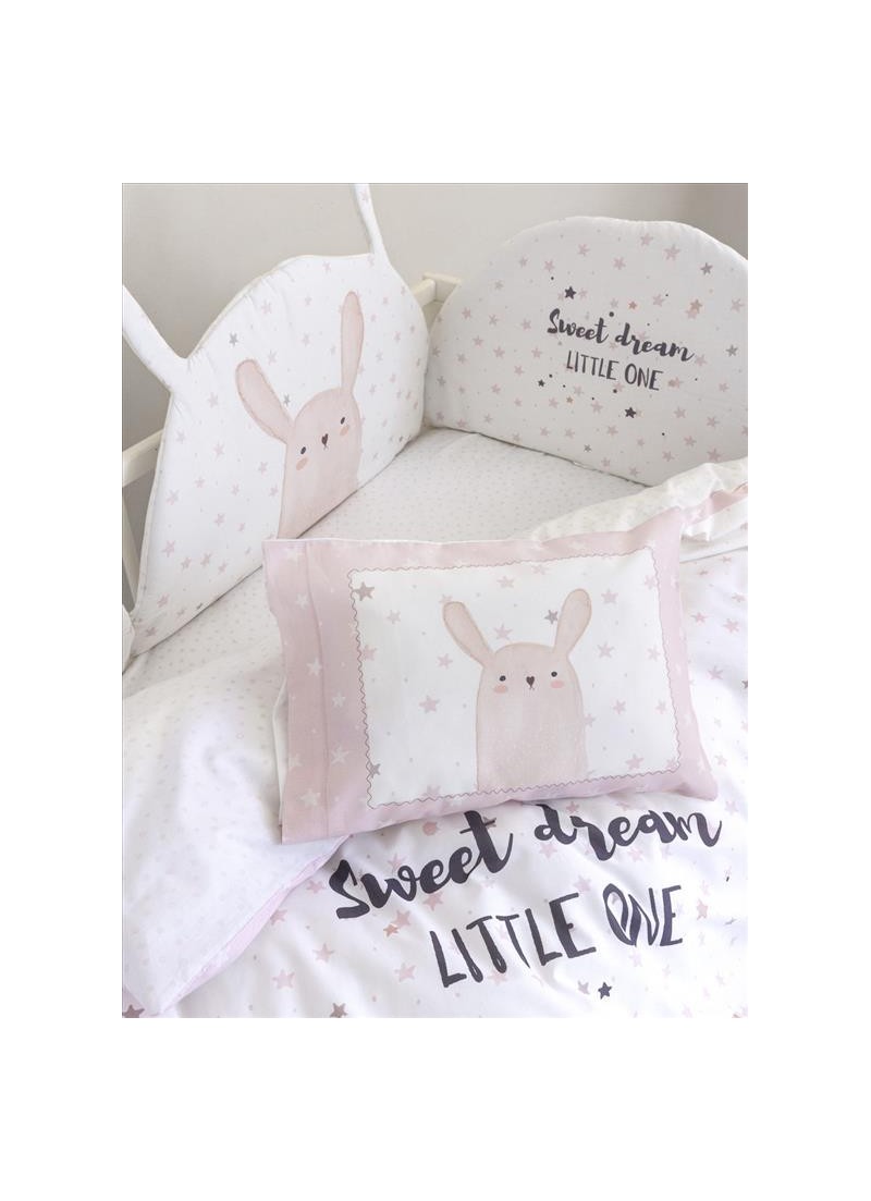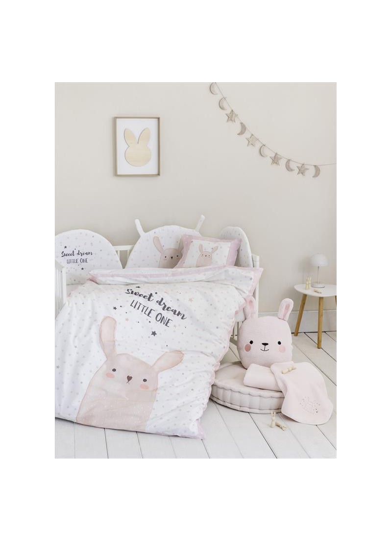 Βρεφικά σεντόνια για την κούνια από την εταιρεία Nima. Σε εκρού-ροζ χρώμα με γκρι λεπτομέρειες και σχέδιο λαγουδάκι. Το κατωσέντονο είναι πουά σε λευκό-ροζ χρώμα.