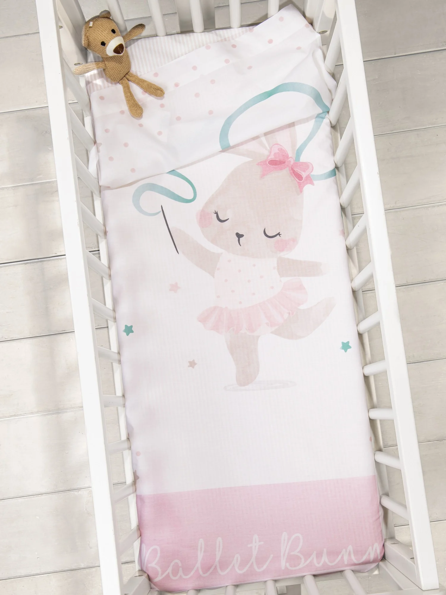 Τα βαμβακερά βρεφικά σεντόνια Ballet Bunny έχουν ένα όμορφο πάνελ σχέδιο με μια γλυκιά λαγουδίνα μπαλαρίνα, πλαισιωμένη από αστεράκια και καρδιές. Οι απαλές αποχρώσεις του ροζ και του λευκού δημιουργούν μια ατμόσφαιρα ηρεμίας και τρυφερότητας, ενώ τα μονόχρωμα τμήματα με τις λεξούλες “Ballet Bunny” προσθέτουν μια παιχνιδιάρικη πινελιά. Μια υπέροχη πάνελ μαξιλαροθήκη απογειώνει την εικόνα του στρωμένου κρεβατιού. Μετατρέψτε τo δωμάτιο της μικρής σας σε ένα μαγικό χαρούμενο χώρο με τα προϊόντα κρεβατιού Ballet Bunny, που περιλαμβάνουν την πάντα το κουβερλί και την κουβερτούλα Ballet Bunny! Θα απολαύσετε το αποτέλεσμα και εσείς μαζί με το μωράκι σας!