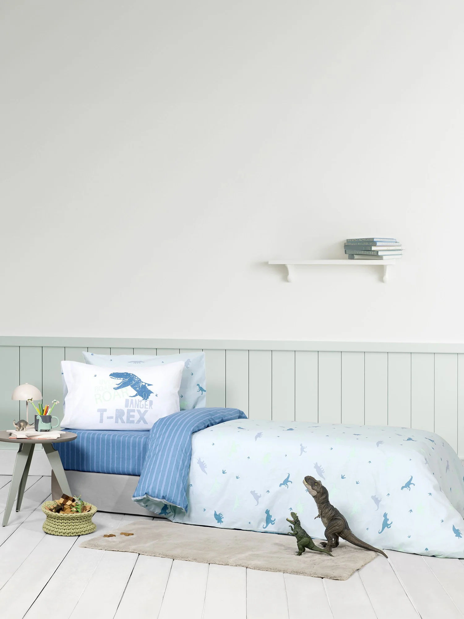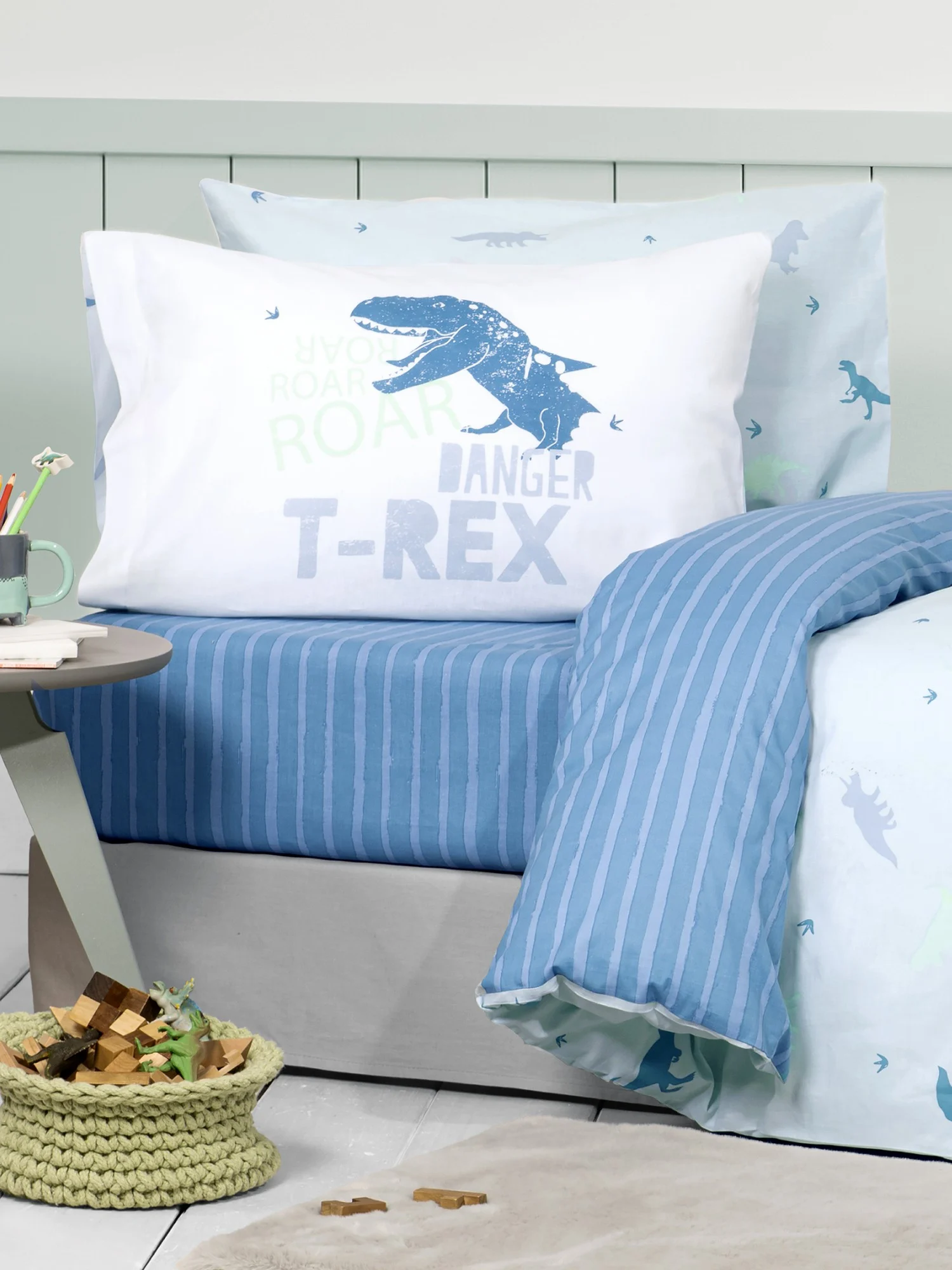 Τo βαμβακερό σετ σεντονιών Roar είναι η απόλυτη επιλογή για τους μικρούς λάτρεις των δεινοσαύρων και της περιπέτειας! Είναι διακοσμημένο με σιλουέτες δεινοσαύρων T-Rex, πάνω σε απαλό γαλάζιο φόντο, δημιουργώντας μια ζωντανή και διασκεδαστική ατμόσφαιρα. Το κατωσέντονο έχει λεπτές γαλάζιες ρίγες πάνω σε έντονο μπλε χρώμα, που προσθέτει δυναμισμό και στυλ. Η μαξιλαροθήκη κλέβει την παράσταση με την εντυπωσιακή εκτύπωση του T-Rex και τη φράση “ROAR RANGER T-REX”, ενισχύοντας την αίσθηση δράσης και εξερεύνησης. Αυτό το σετ σεντονιών θα ξυπνήσει τη φαντασία των παιδιών και θα μετατρέψει το παιδικό κρεβάτι σε ένα πεδίο εξερεύνησης.